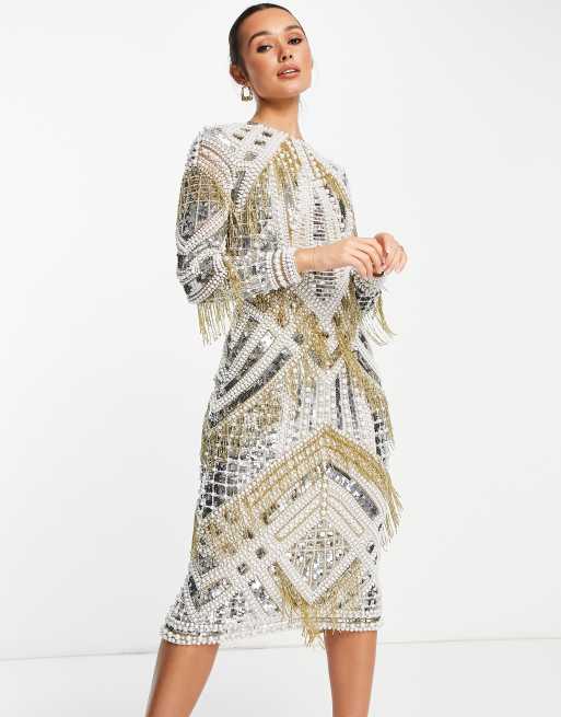 ASOS EDITION - Midi-bodyconjurk met versiering, pareltjes en franjes in zilver