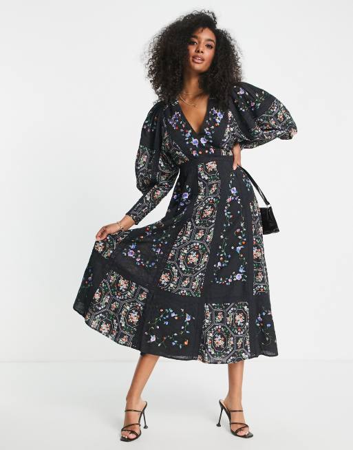 ASOS EDITION - Midi jurk met geborduurde bloemen en kanten inzetstukken in zwart