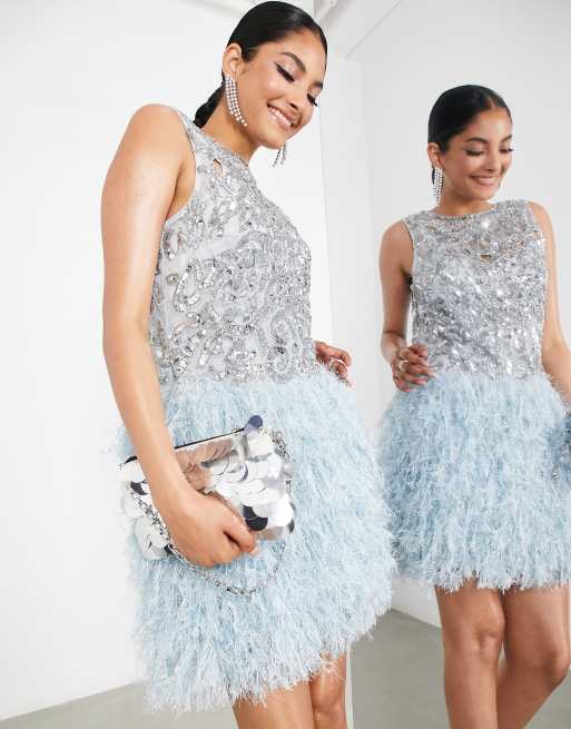 ASOS EDITION - Mini jurk met opengewerkt lijfje met lovertjes en imitatieveren langs de zoom in blauw