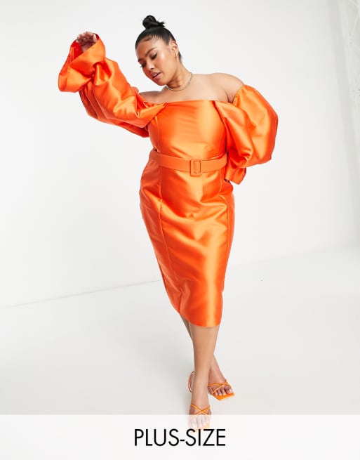ASOS LUXE Curve - Midi jurk van satijn met ceintuur en structuur en dramatische mouwen in feloranje