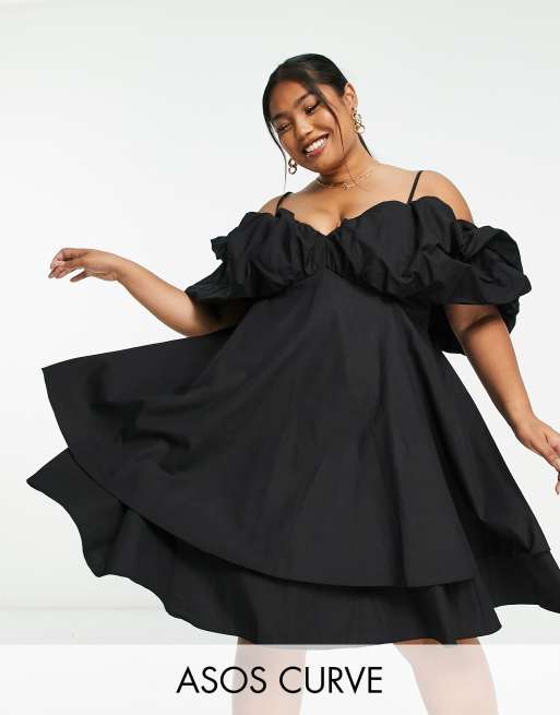 ASOS LUXE Curve - Mini-jurk met bolle bardothals in zwart