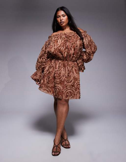 ASOS LUXE - Curve - Oversized mini jurk met blote schouders, textuur en elastische taille in chocoladebruin