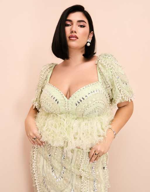 ASOS LUXE Curve - Top met pofmouwen, versiering en hangende pareltjes in groen, deel van co-ord set