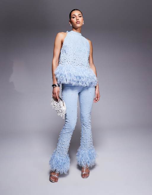 ASOS LUXE - Denim jeans met versiering van parels en imitatieveren aan de zoom in blauw, deel van co-ord set