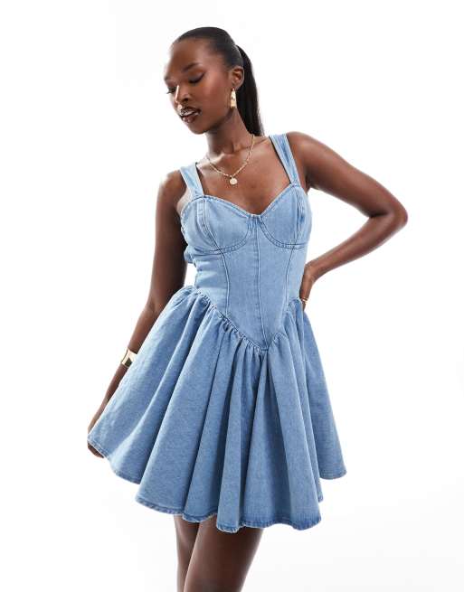 ASOS LUXE - Denim mini skaterjurk met korset en strik achter in mid-wash blauw