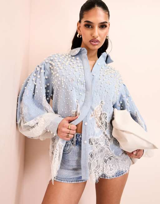 ASOS - LUXE - Denim overhemd versierd met parels en kanten details in middenblauwe wassing
