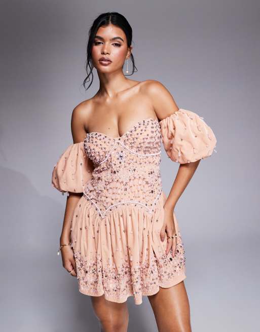 ASOS LUXE - Fluwelen mini jurk met pofmouwen, blote schouders en versierd met edelstenen in perzikkleur