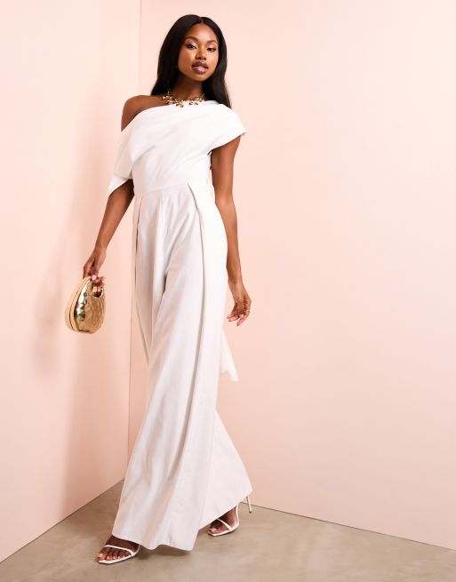 ASOS LUXE - Jumpsuit met verlaagde schouders en strik achter in crème