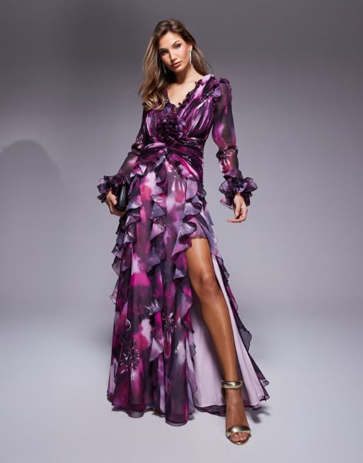 ASOS LUXE - Maxi-jurk van organza met lange mouwen en ruches in donker bloemmotief