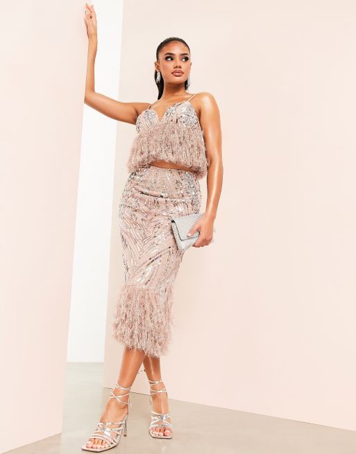 ASOS LUXE - Midirok versierd met sierstenen en zoom met imitatieveren in nertsroze