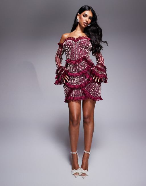 ASOS LUXE - Mini jurk met blote schouders, geschulpte zoom en edelstenen versiering in bordeauxrood