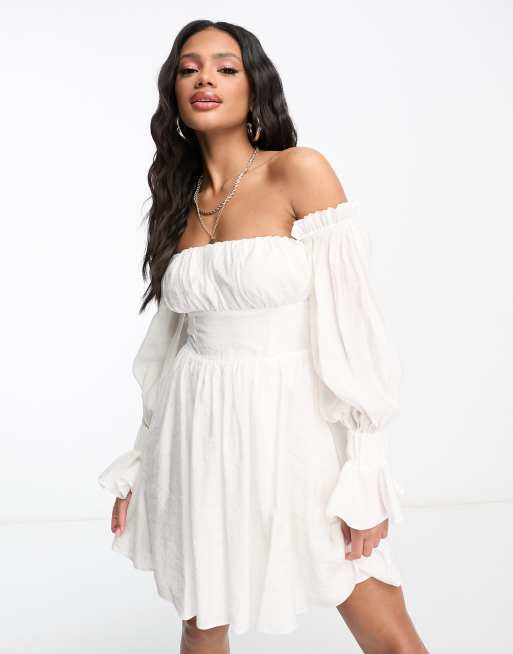 ASOS LUXE - Mini jurk met blote schouders, korset en blousonmouwen in wit