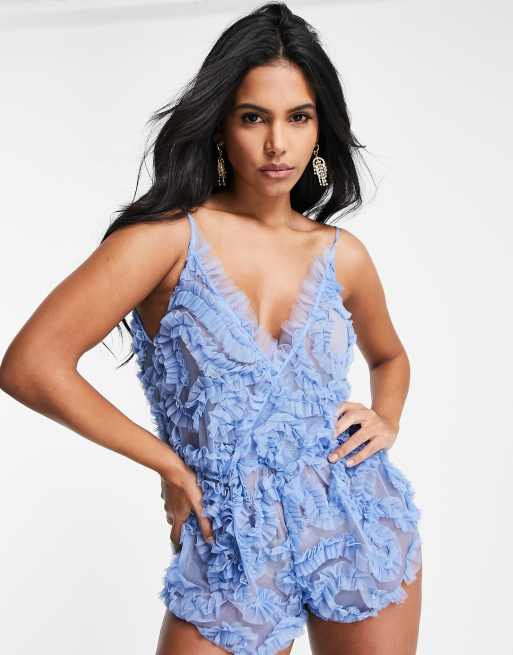 ASOS LUXE - Playsuit van 3D kant met camibandjes in blauw