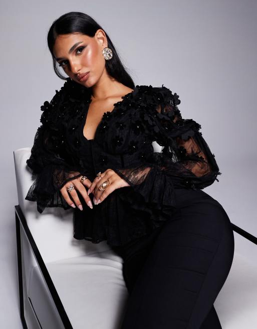 ASOS LUXE - Top van mesh met bardot halslijn,lange mouwen, bloemen van fluweel en parels in zwart