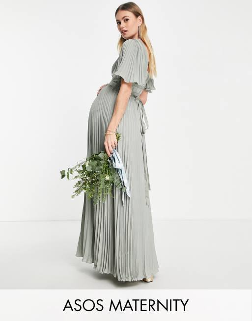 ASOS DESIGN Maternity - Geplooide lange bruidsmeisjesjurk met fladdermouwen en satijnen overslag in de taille in olijfgroen