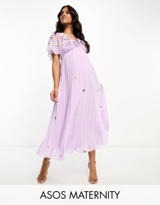 ASOS DESIGN Maternity - Geplooide midi jurk met V-hals, uitlopende mouwen en borduursels in lila