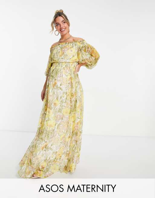 ASOS DESIGN Maternity - Maxi jurk met blote schouders, blousonmouwen, bloemenprint en strepen in dezelfde kleur