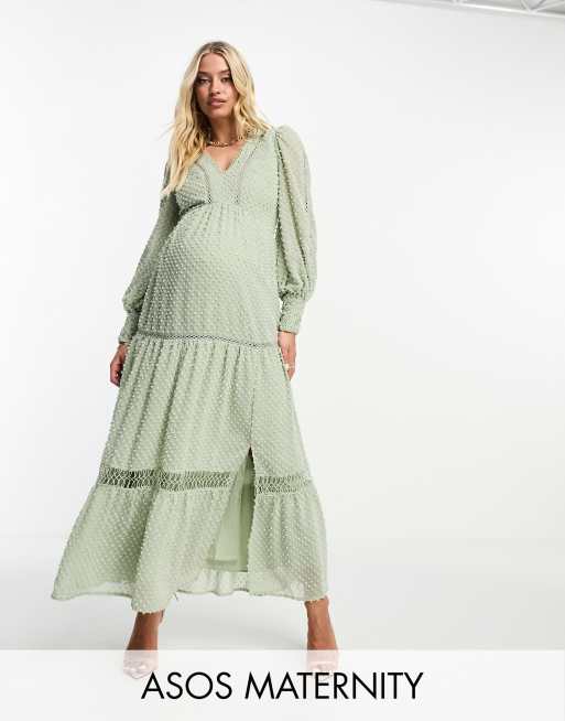 ASOS DESIGN Maternity - Maxi jurk van getufte dobbystof met kanten inzetstuk in licht saliegroen