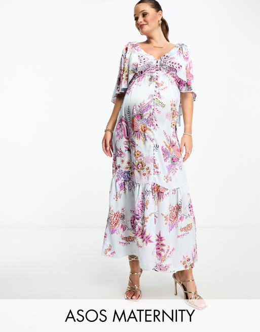 ASOS DESIGN Maternity - Satijnen maxi jurk met fladdermouwen, V-hals en gelaagde zoom in paisley motief