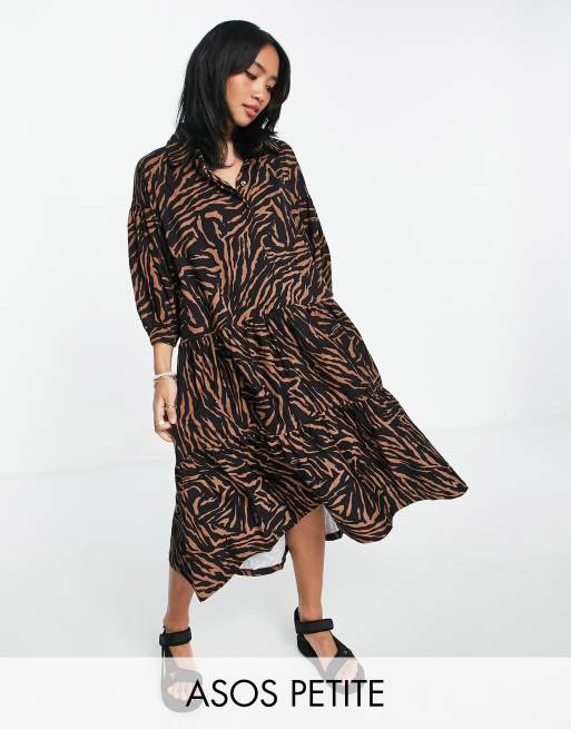 ASOS DESIGN Petite - Aangerimpelde midi overhemdjurk met lagen en pofmouwen in zwart met zebraprint
