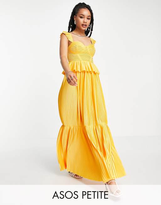 ASOS DESIGN Petite - Geplooide, gelaagde lange jurk met korsetdetail in goudgeel
