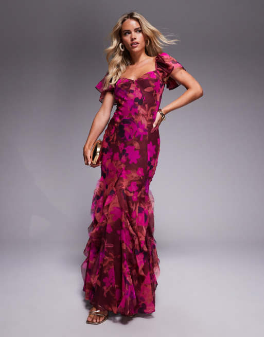 ASOS DESIGN Petite - Maxi-jurk met fladdermouwen en godet-ruches in felroze bloemenprint