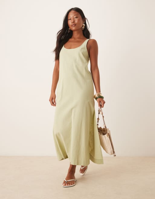 ASOS DESIGN Petite - Midi jurk met lage ronde hals van katoenlinnen in saliegroen
