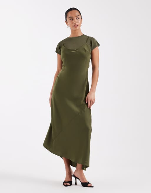 ASOS DESIGN Petite - Satijnen 2 in 1 T-shirt en midi-jurk met camibandjes in kaki