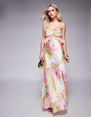 ASOS DESIGN Petite - Satijnen maxi cami-jurk met buste van chiffon in roze bloemenprint
