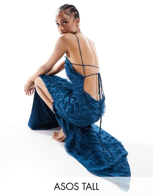 ASOS DESIGN Tall - Asymmetrische maxi-jurk met uitsnijding en onafgewerkte randen in petroleumblauw