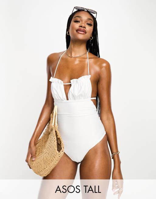 ASOS DESIGN Tall - Bandeau-badpak met ruches in wit