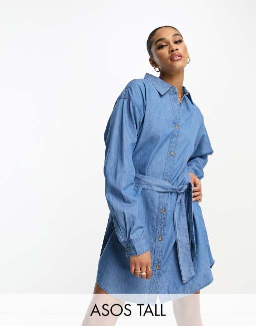 ASOS DESIGN Tall - Denim mini jurk met riem in mid-wash