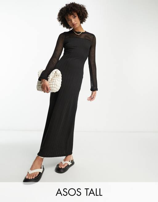 ASOS DESIGN Tall - Geribbelde midi jurk met lange mouwen en gehaakt inzetstuk in zwart
