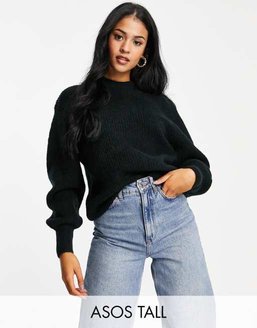 ASOS DESIGN Tall - Geribbelde trui met ronde hals van pluizig garen in zwart