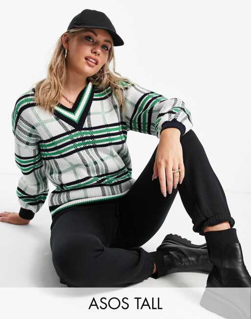 ASOS DESIGN Tall - Geruite trui met V-hals in crème