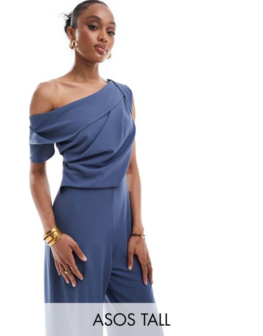 ASOS DESIGN Tall - Jumpsuit met wijde pijpen en schouderplooi in blauw