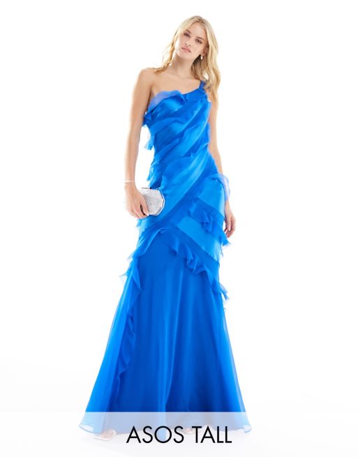 ASOS DESIGN Tall - Lange jurk met blote schouder en ruches van mix van satijn en chiffon in kobaltblauw