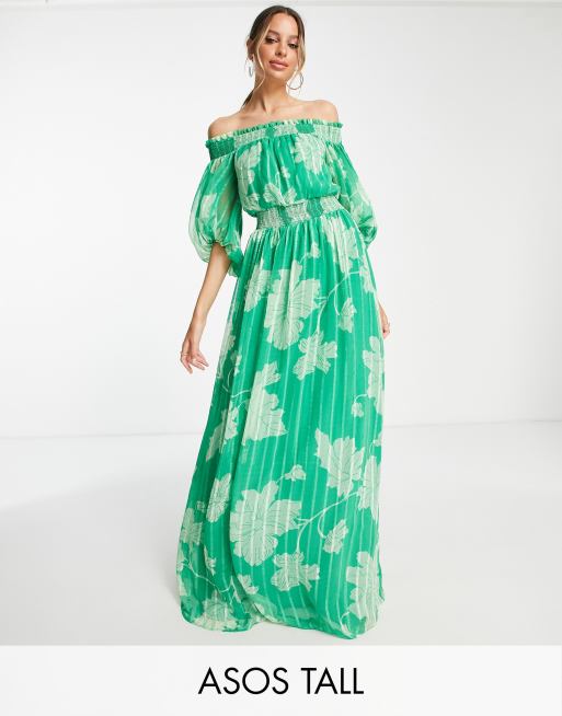 ASOS DESIGN Tall - Lange jurk met blote schouders, blousonmouwen, bloemenprint en strepen in dezelfde kleur