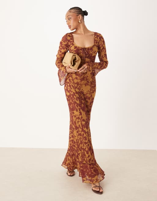 ASOS DESIGN Tall - Maxi-jurk met gerimpelde buste, lange mouwen en abstracte print in oranje