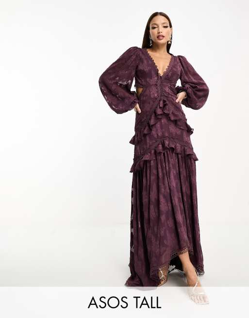 ASOS DESIGN Tall - Midi jurk van gebloemd jacquard met uitsnijding in wijnrood