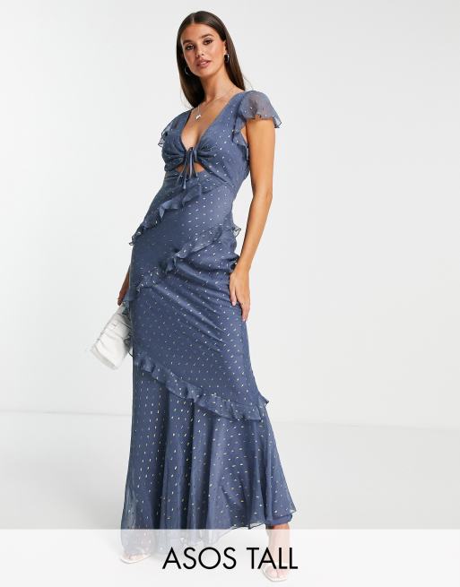 ASOS DESIGN Tall - Nette satijnen maxi-jurk met ongelijke zoom en ruches aan de mouwen van fil coupé