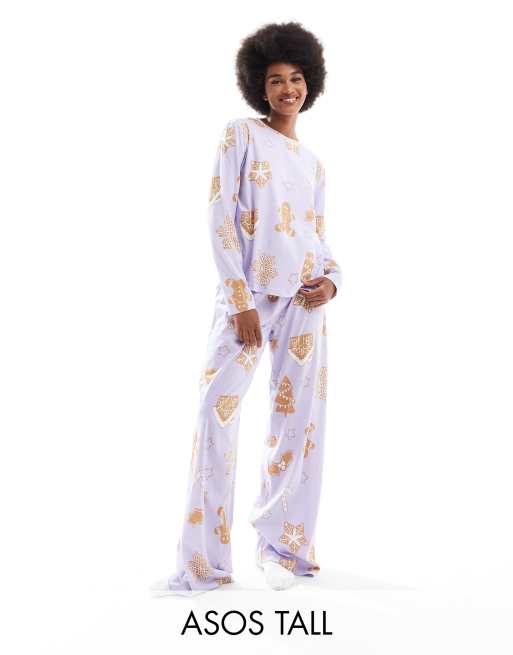 ASOS DESIGN Tall - Pyjamaset met top met lange mouwen en broek met gingerbread-print in paars