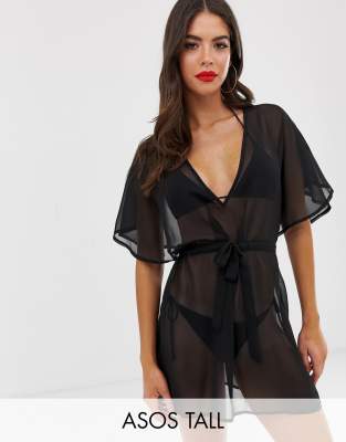 ASOS DESIGN Tall - Recycled - Chiffon strandtuniek met gestrikte taille in zwart