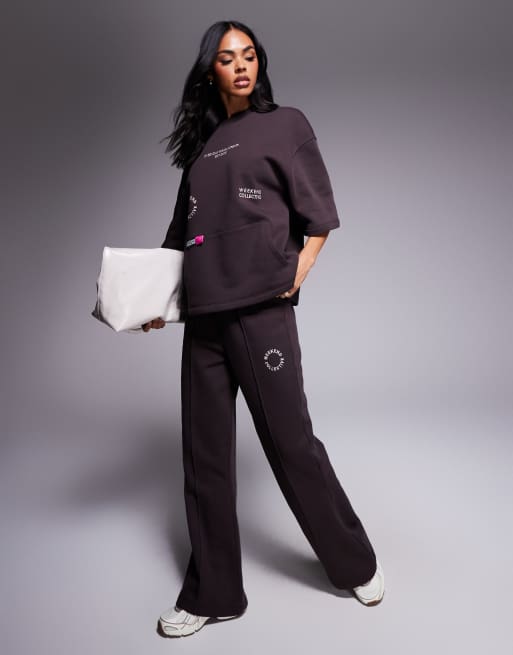 Weekend Collective - Joggingbroek met uitlopende pijpen en grafisch roze borduursel in chocoladebruin