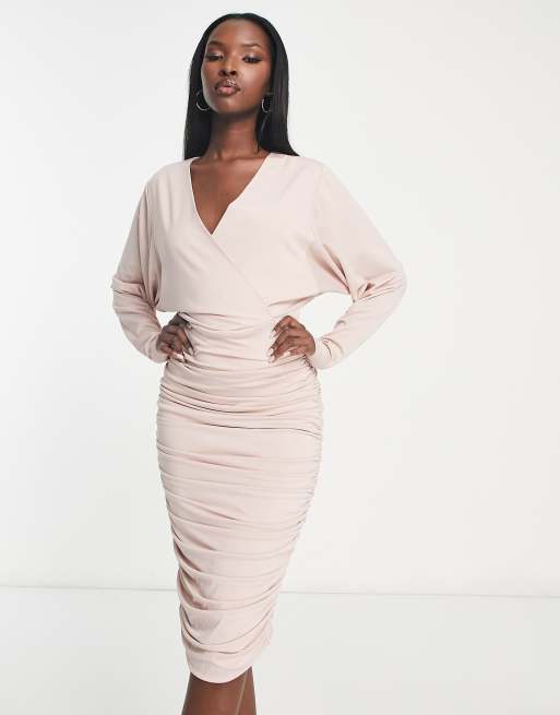 AX Paris - Gerimpelde midi jurk met vleermuismouwen in zachtroze