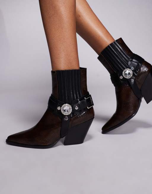 Azalea Wang - Lenkov - Western enkellaarsjes met hak en harnasdetail in bruin