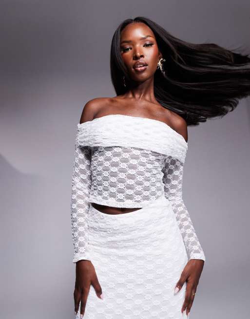 Bardot - Bardot-top van kant en mesh met lange mouwen in wit, deel van co-ord set