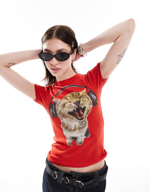 Basic Pleasure Mode - Baby T-shirt met kat met koptelefoon in rood