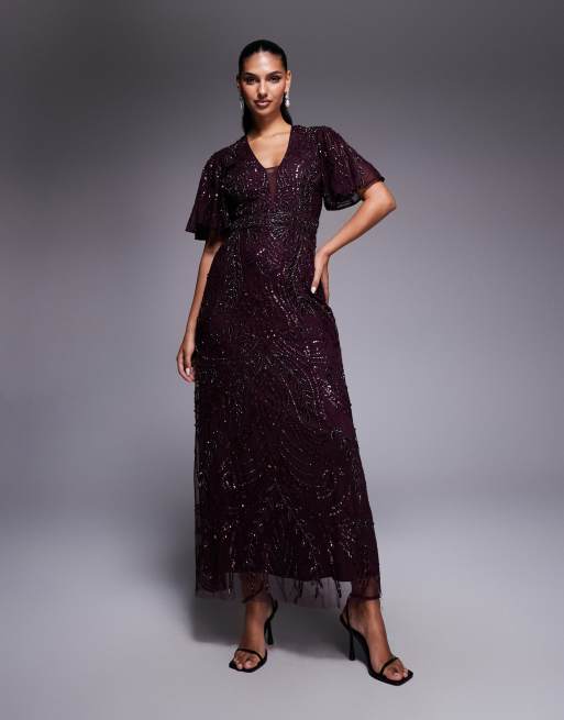 Beauut - Maxi-jurk met kralenversiering, kapmouwen en V-hals met mesh inzetstuk in bordeauxrood