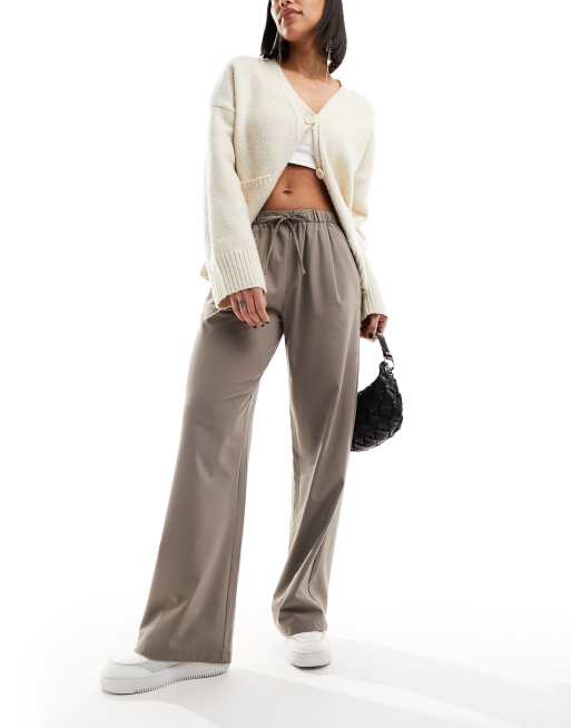 Bershka - Broek met gestrikte taille en wijde pijpen in lichtbruin
